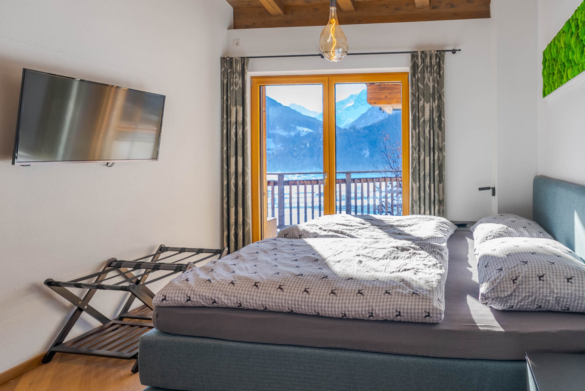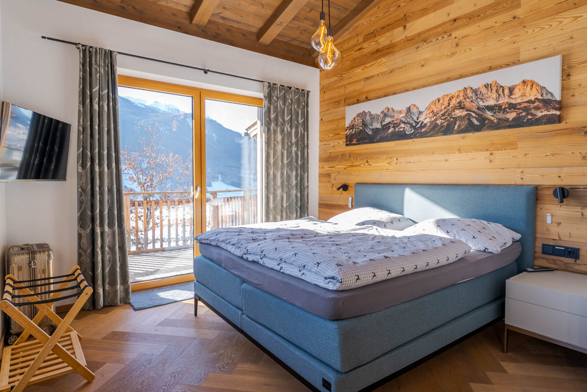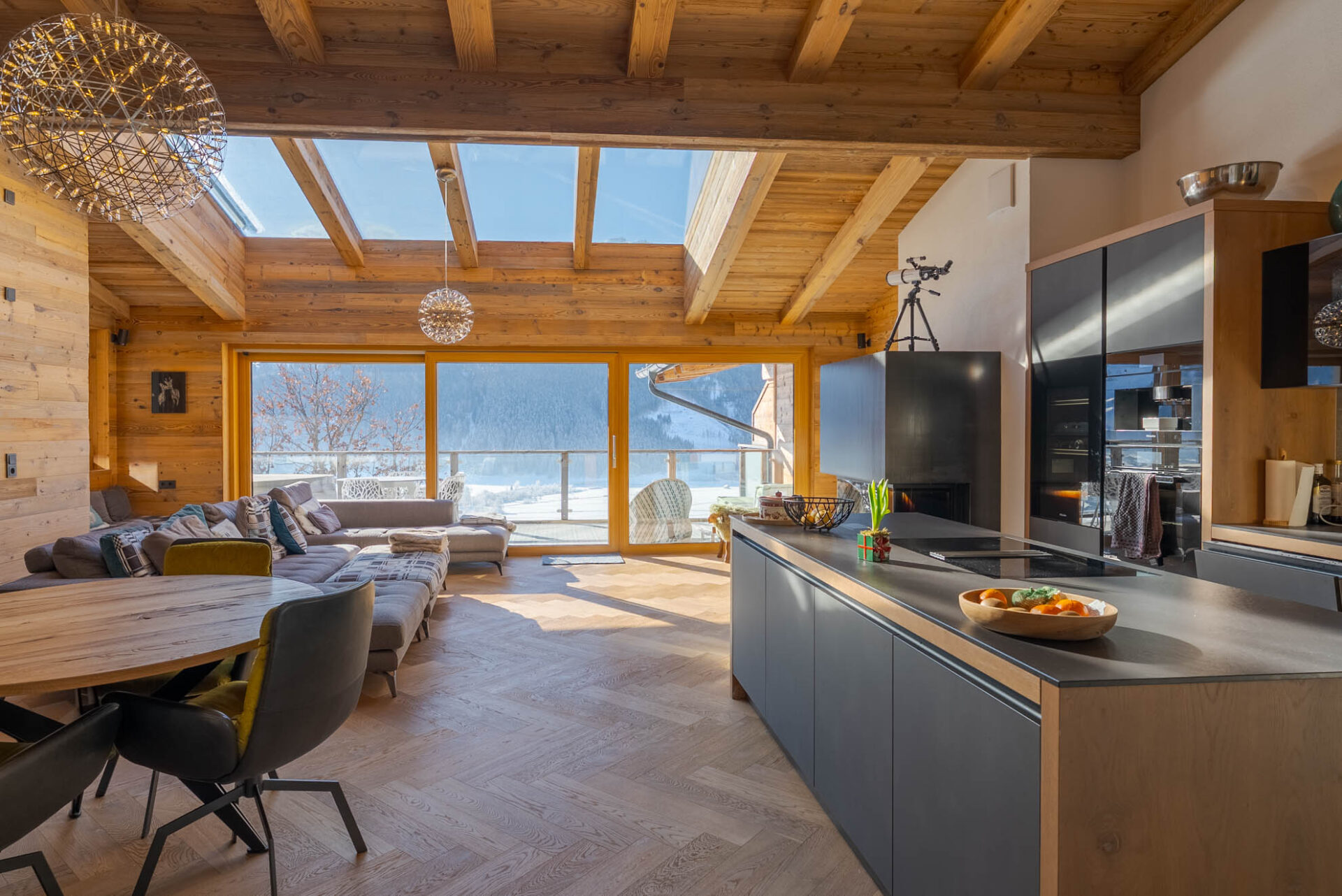 Der weitläufige Wohn- und Essbereich bildet das Herz der Wohnung. Von hier aus öffnet sich der Blick in die umliegende Berglandschaft und auf den großzügigen Balkon, der den Innenraum selbstverständlich nach außen erweitert. Licht, Aussicht und Materialität stehen dabei nicht im Vordergrund – sie begleiten den Raum leise und selbstverständlich.
