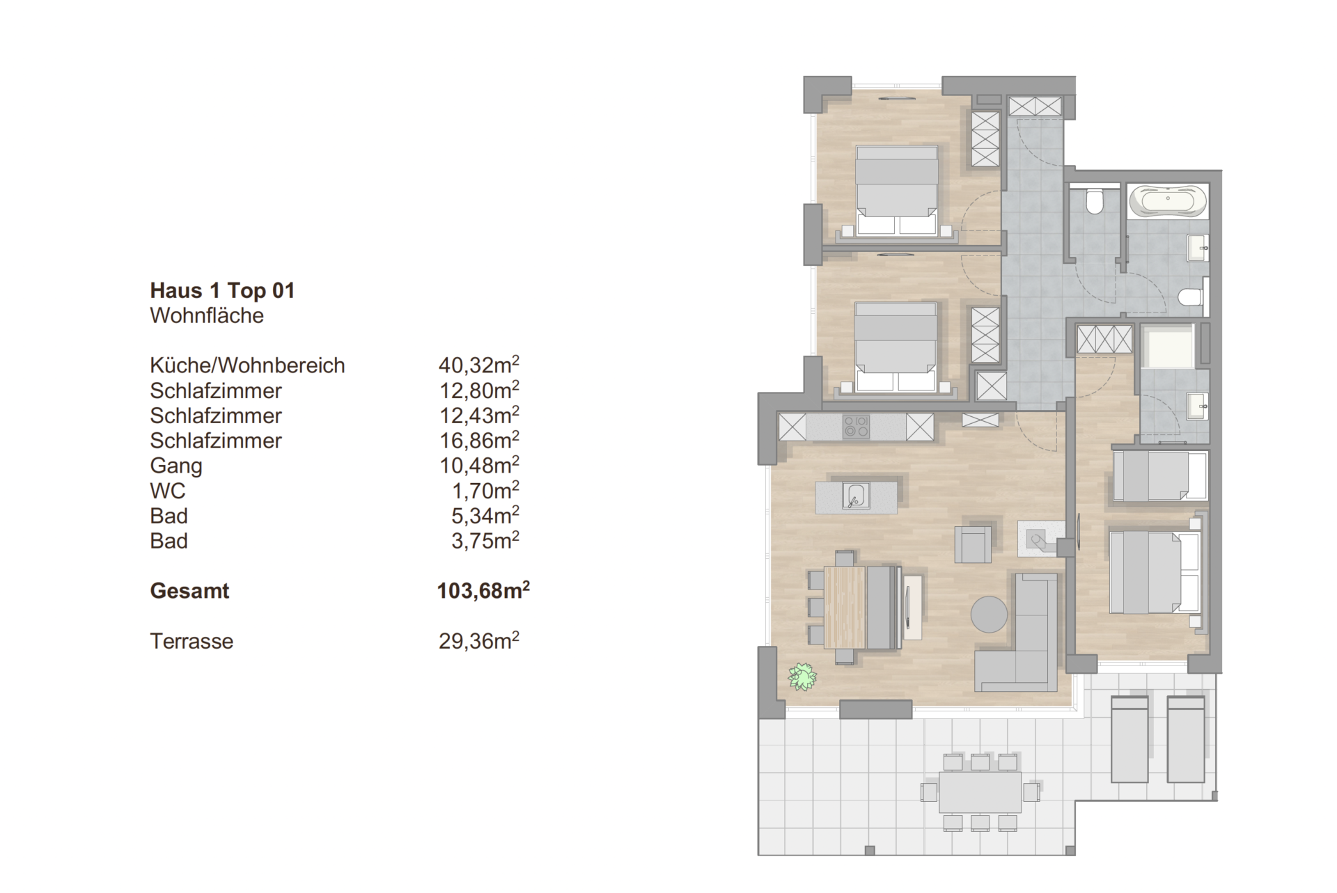 Der 40 m² große Wohn- und Kochbereich bildet das Herz der Wohnung: helle Materialien, viel Glas und der direkte Zugang zur Terrasse schaffen eine offene, entspannte Atmosphäre, in der sich sowohl Familien als auch Paare sofort wohlfühlen. Drei vollwertige Schlafzimmer – eines davon mit Bad en suite – gewährleisten optimale Privatsphäre. Zwei Badezimmer und ein separates Gäste-WC machen das Apartment zudem äußerst praktisch für Familien und Besucher.
