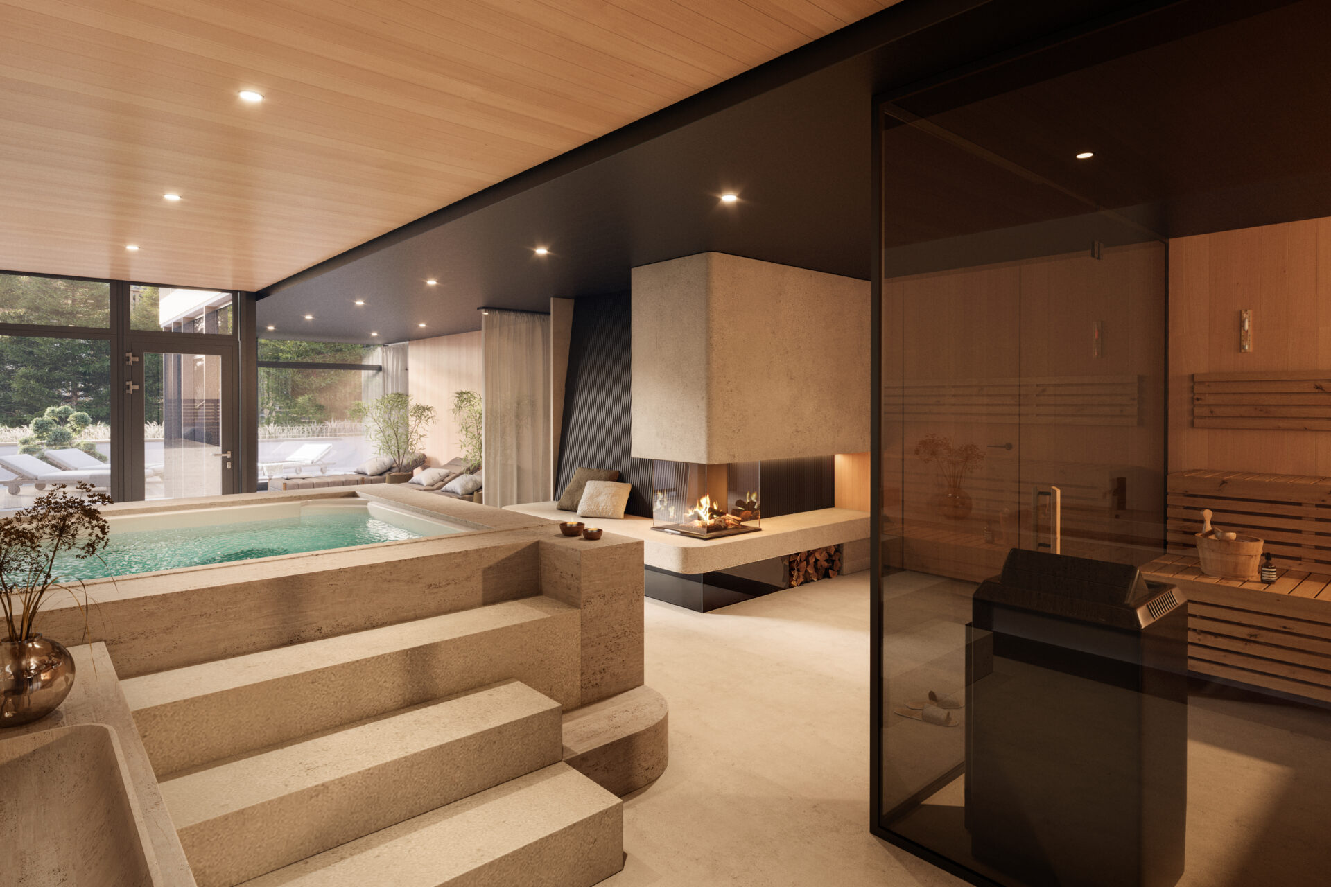 Der private Spa-Bereich lässt keine Wünsche offen: Sauna, Dampfbad, Kaltwasserbecken und ein lichtdurchfluteter Ruheraum schaffen Raum für Entspannung und Regeneration. Ergänzt wird das Angebot durch einen Fitnessraum sowie einen direkten Zugang zum Garten mit Sonnenterrasse – Wellness und Natur im perfekten Einklang.