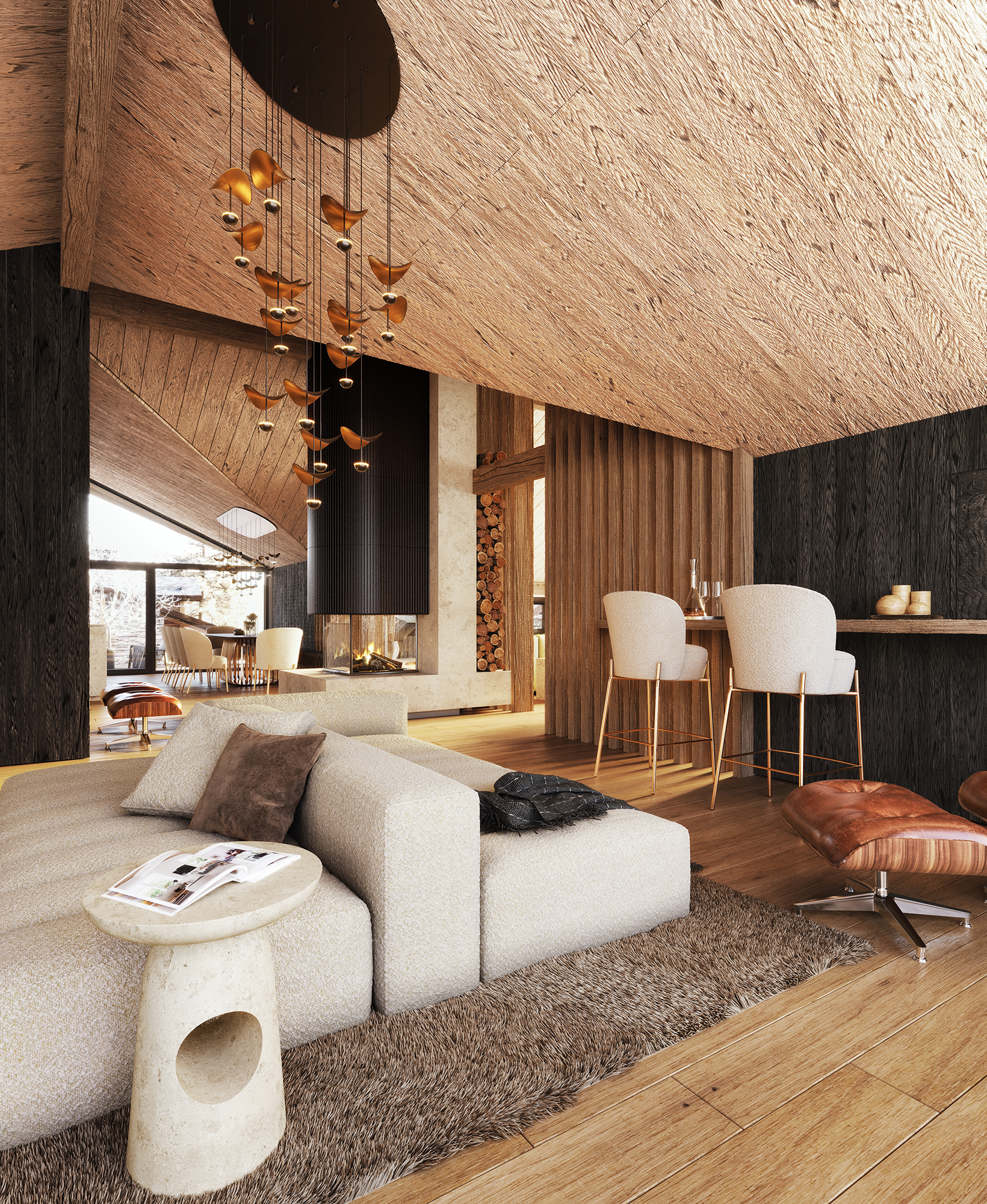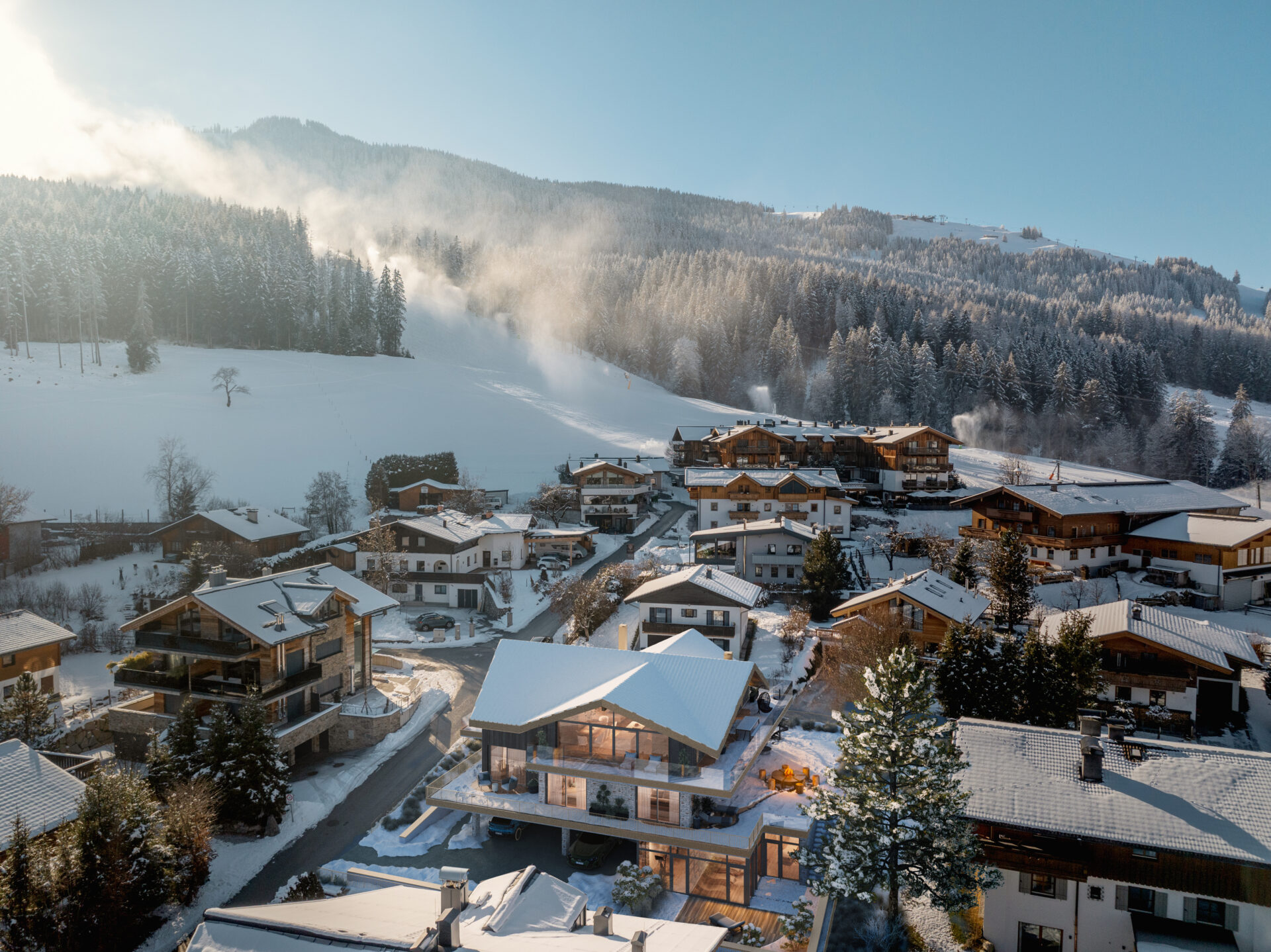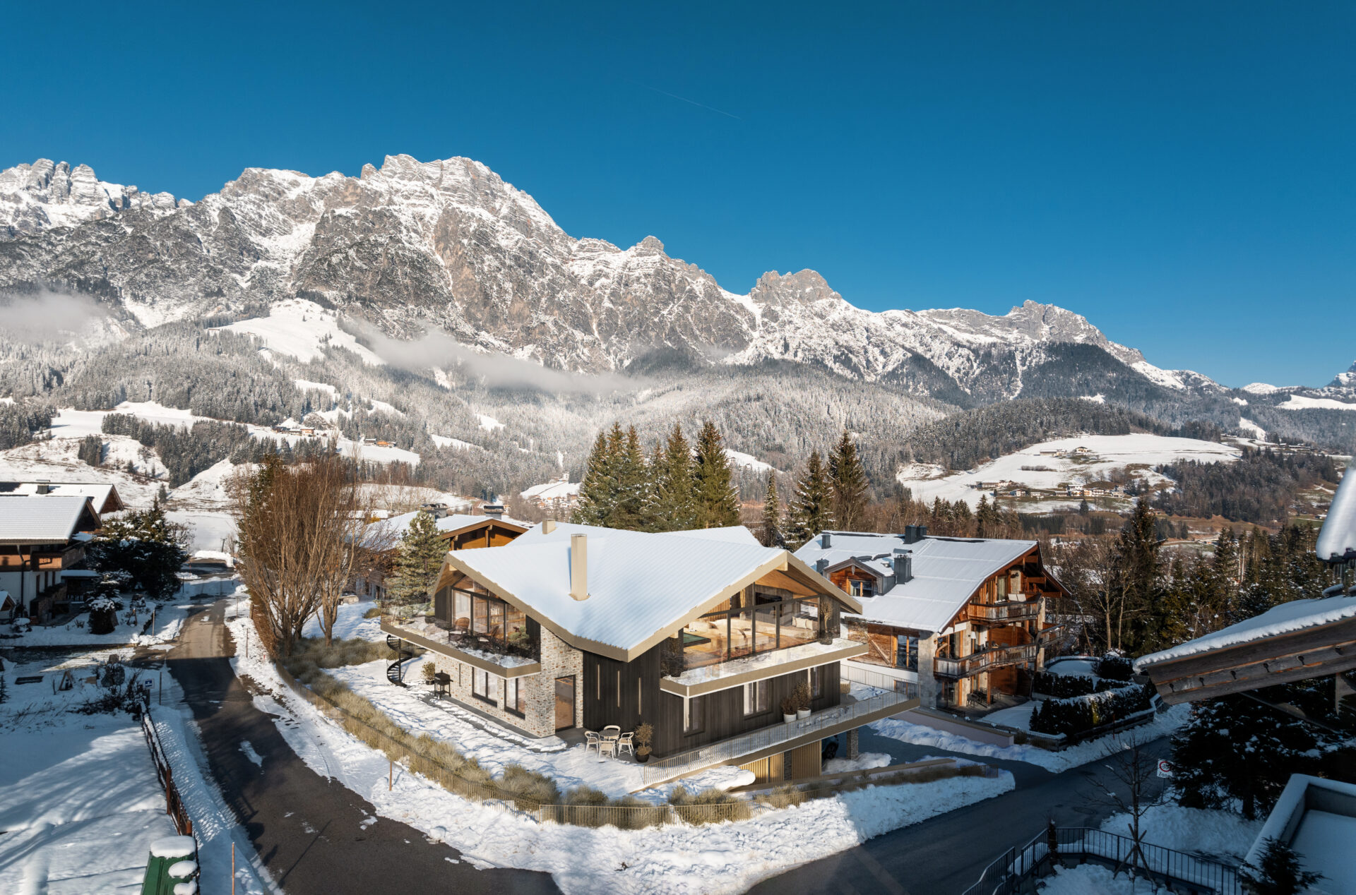 Die Architektur verbindet klare Linien mit natürlichen Materialien wie Altholz, Naturstein und Eichenparkett. Großzügige Glasfronten öffnen den Blick auf die Leoganger Bergwelt, während durchdachte Grundrisse helle Wohnräume, Privatsphäre in den Schlafzimmern und fließende Übergänge zwischen innen und außen schaffen. So entsteht ein Ambiente, das Wärme, Authentizität und Zeitlosigkeit vermittelt.